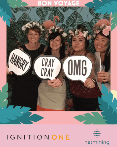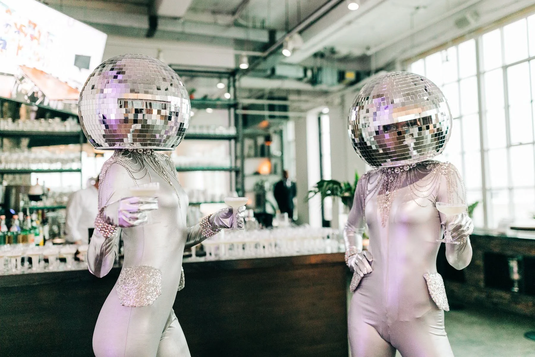 Group of people posing with balloons, mirror text saying "Gay as a Cha Cha Queen," and a disco ball at an event.