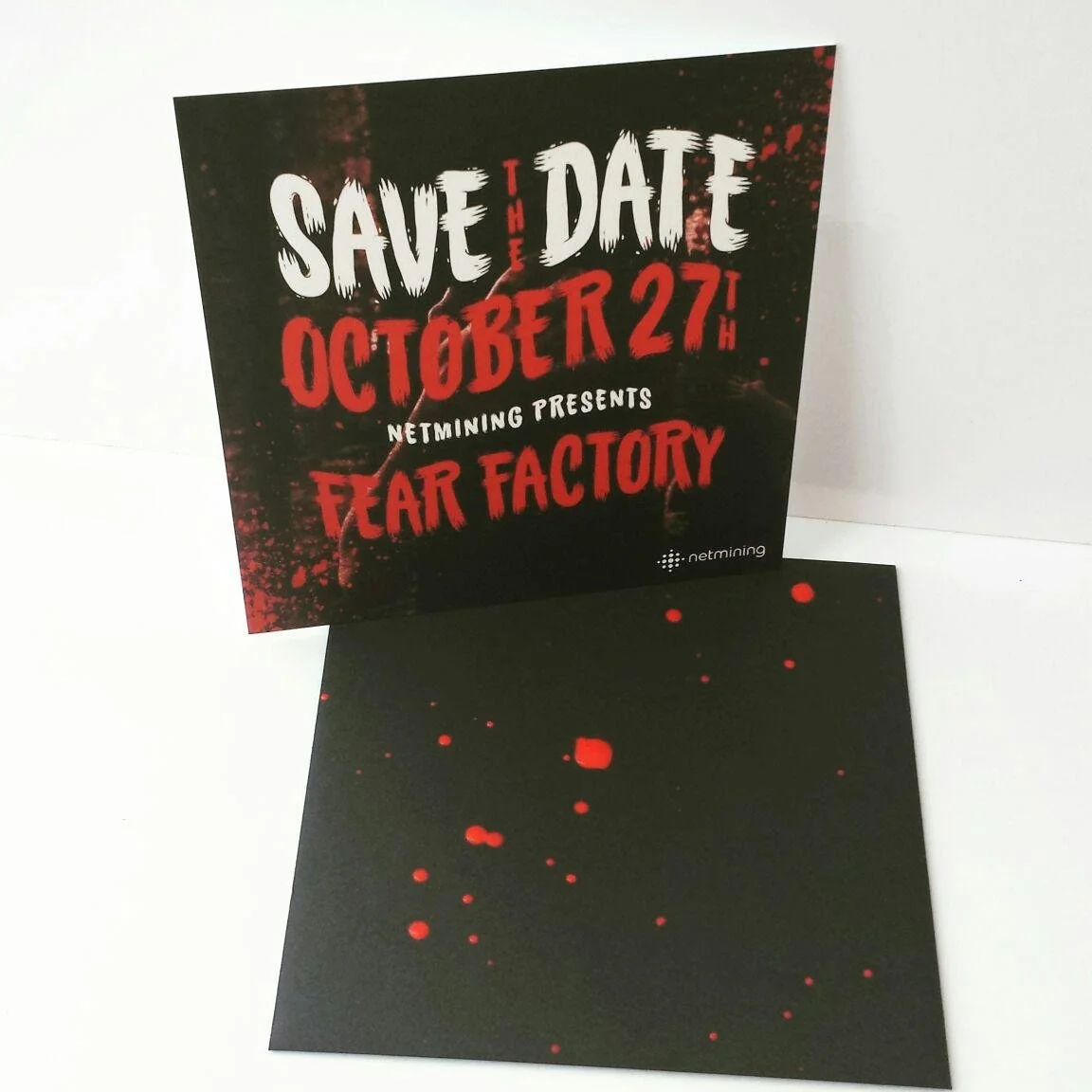 Promotional card with text 'Save the Date October 27th Netmining Presents Fear Factory' with red paint splatters on a black background.
