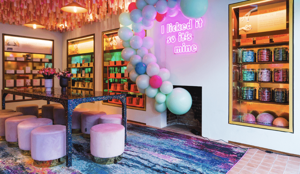 Colorful interior with pastel balloons, neon sign reading "I licked it so it's mine," shelves with jars and items, a table, and pink stools. The ceiling is decorated with hanging strips.