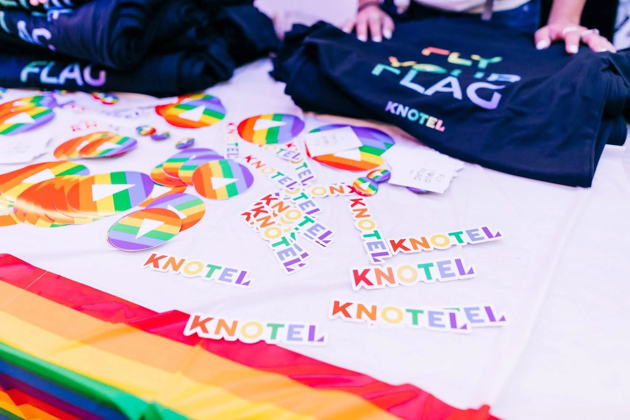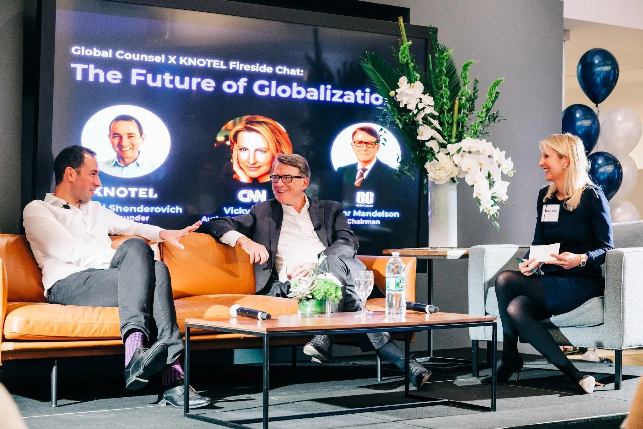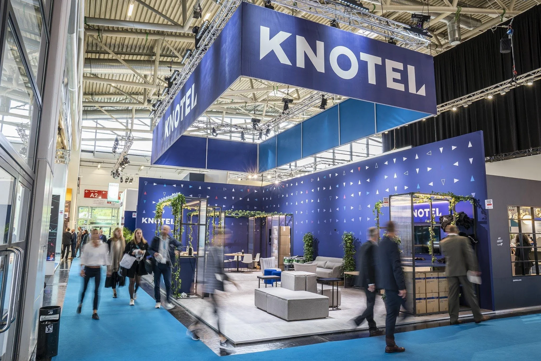 Trade show booth for Knotel showcasing workspace solutions, with seating area, branded items, and a list of global cities on a green textured wall.