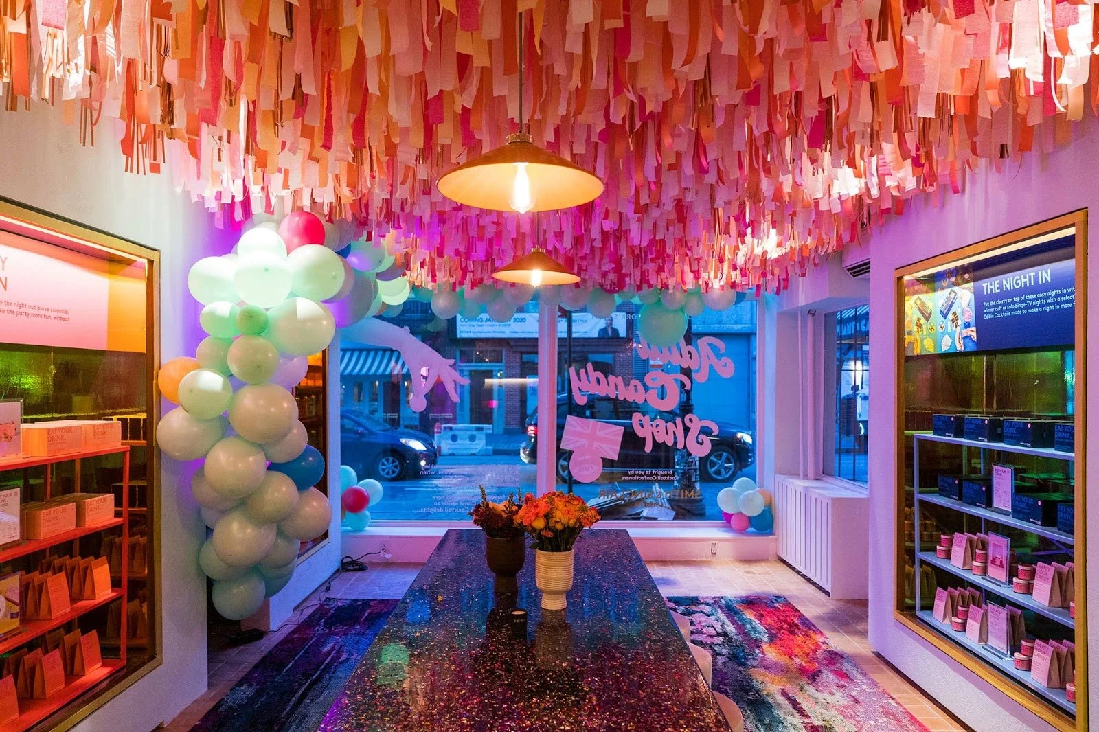 Interior of a colorful candy store with hanging decorations, glowing lamps, and balloon arrangements near the window. Shelves with products are visible on the sides, and a central table is adorned with floral arrangements and glitter. The window disp