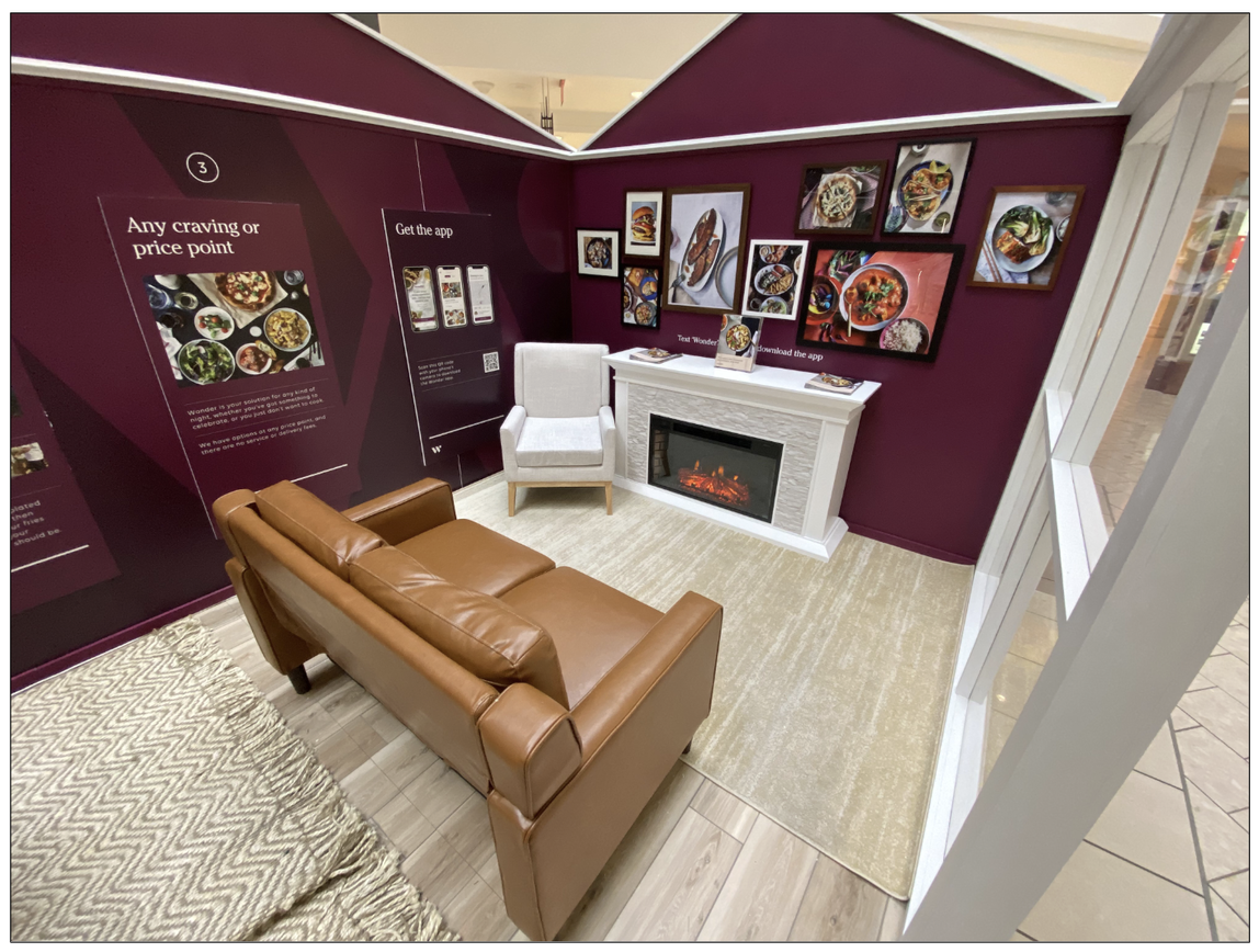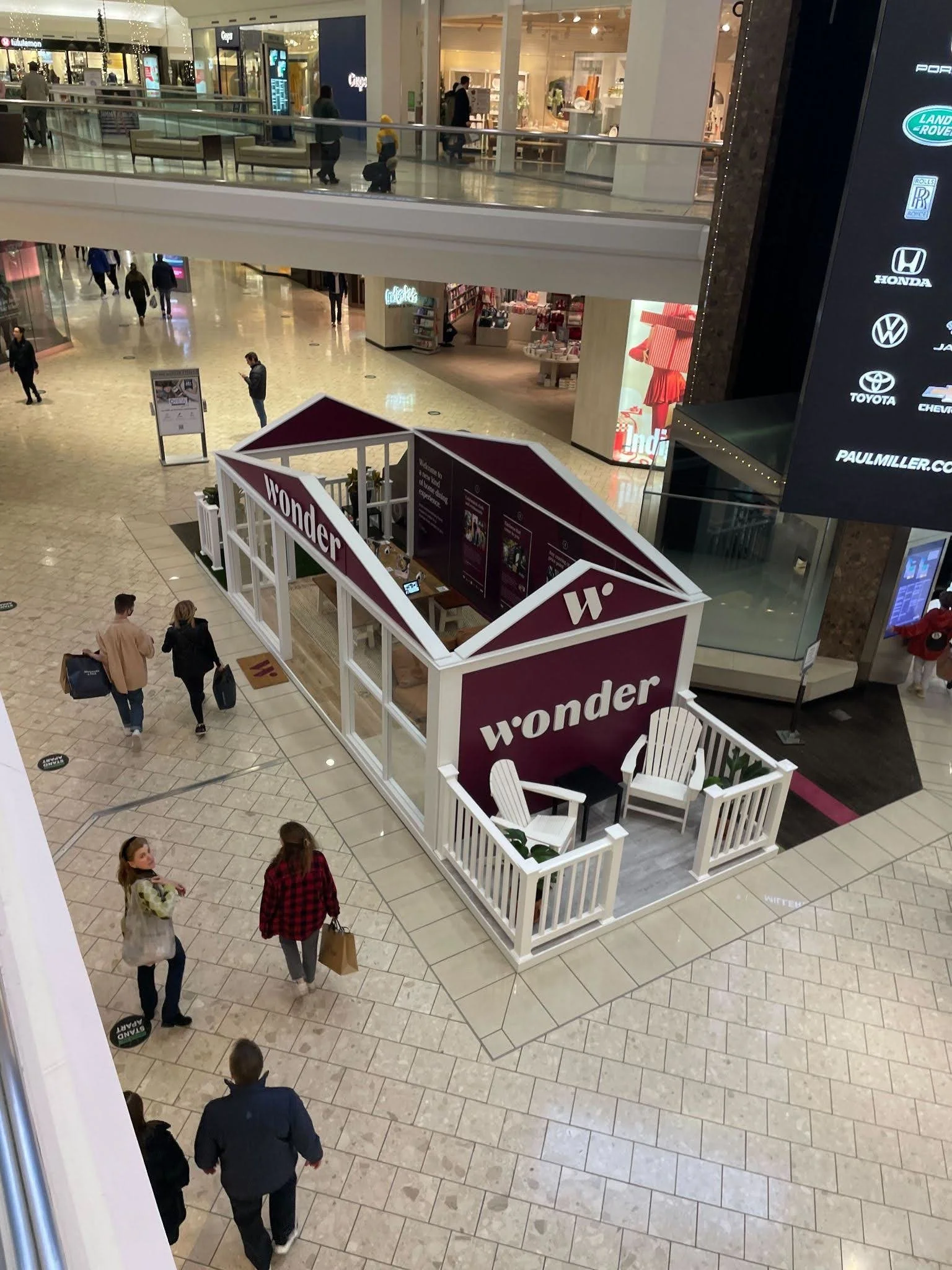 Indoor shopping mall with "Wonder" branded booth, white picket fence, deck chairs, people walking by, and various stores in the background.
