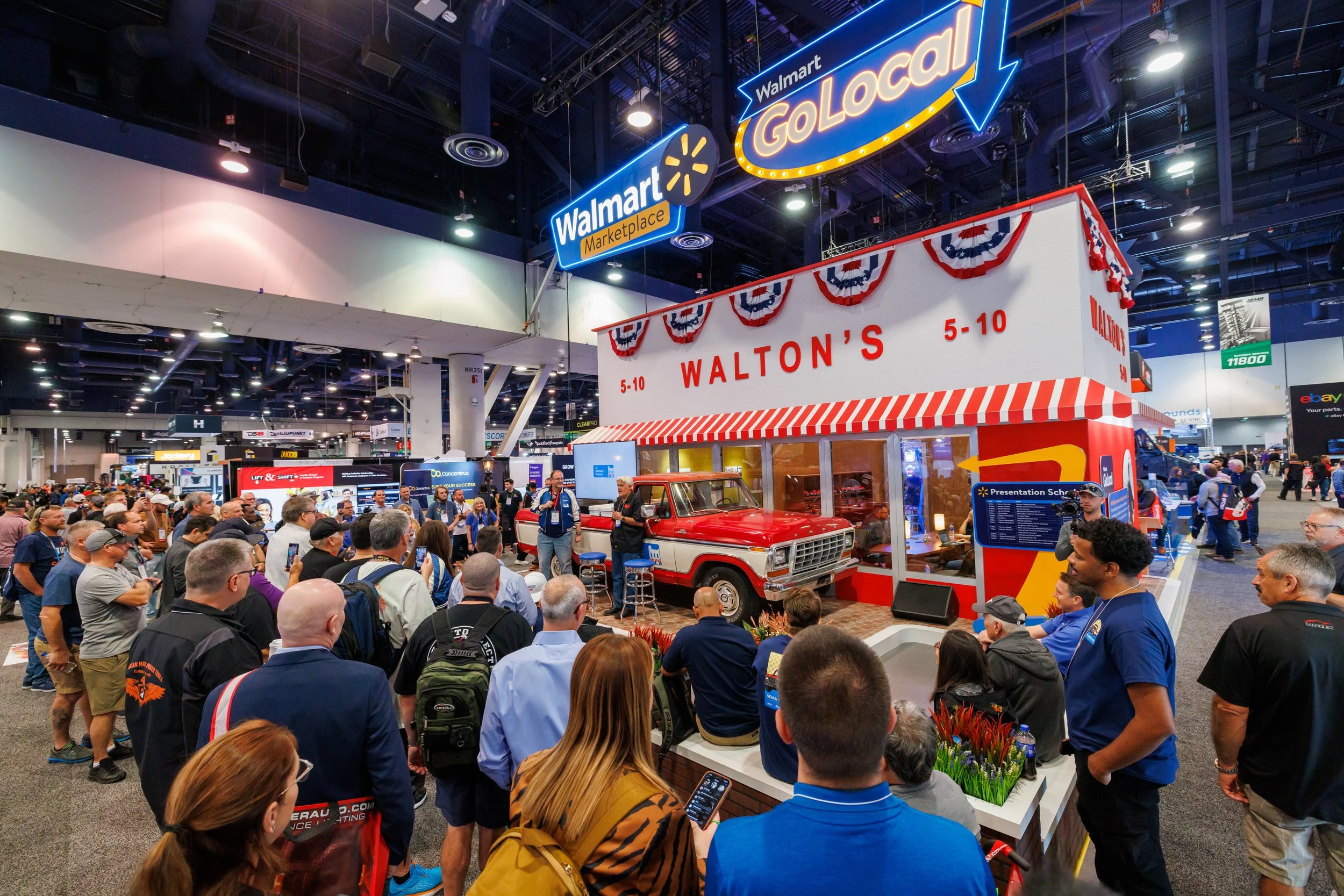 Walmart booth at a trade show with a classic red pickup truck and "Walton's 5-10" signage, surrounded by a crowd of people.