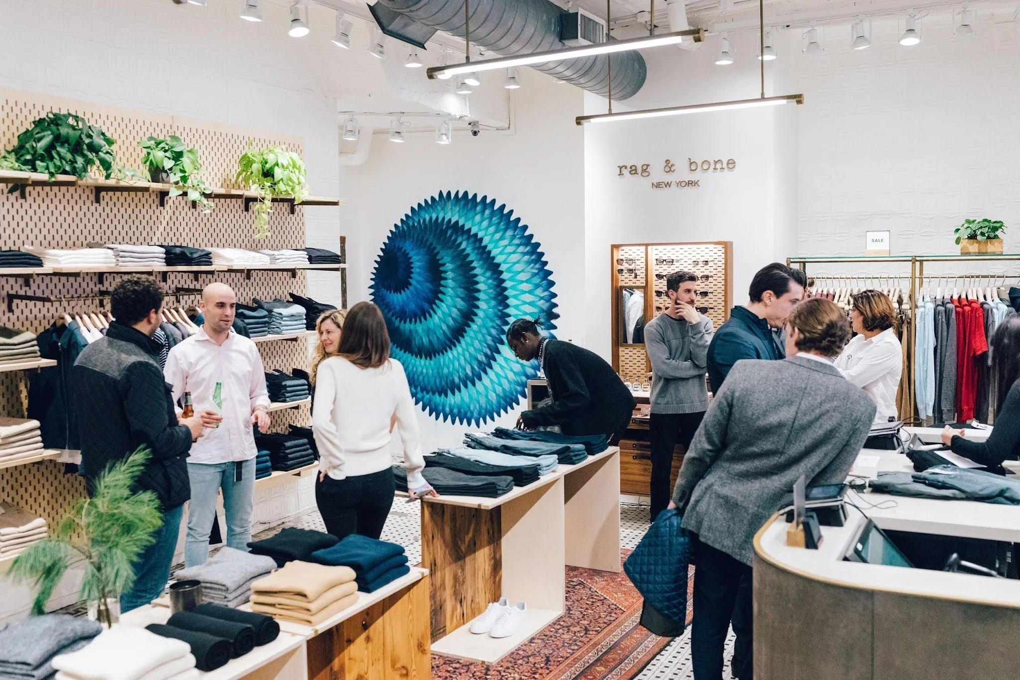 People mingling inside a Rag & Bone clothing store with folded clothes and hangers in the background. Decorative plants and a blue spiral artwork adorn the walls.